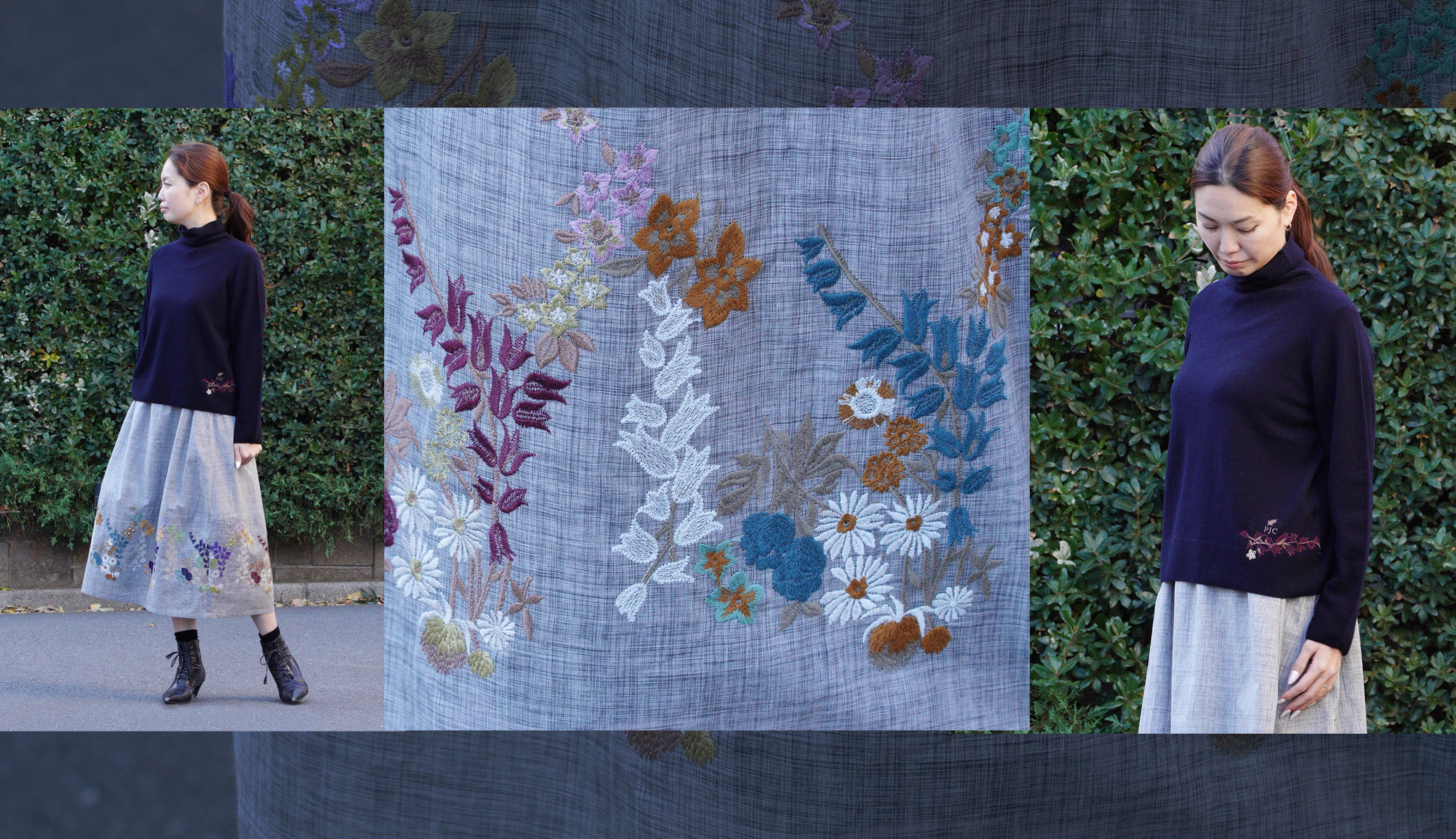 ホールガーメント タートルニット 1ポイント花園刺繡 ダークネイビー