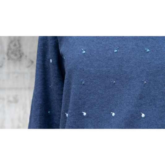 また特殊紡績方法の糸で通常では表現できない、メランジ感の表情を持たせたオーガニックコットン糸を使用しているため、ネイビー、グレー、サックスなど、一味違う染色による表情感があります。市場に出る量が非常に限られたこだわりの素材です。