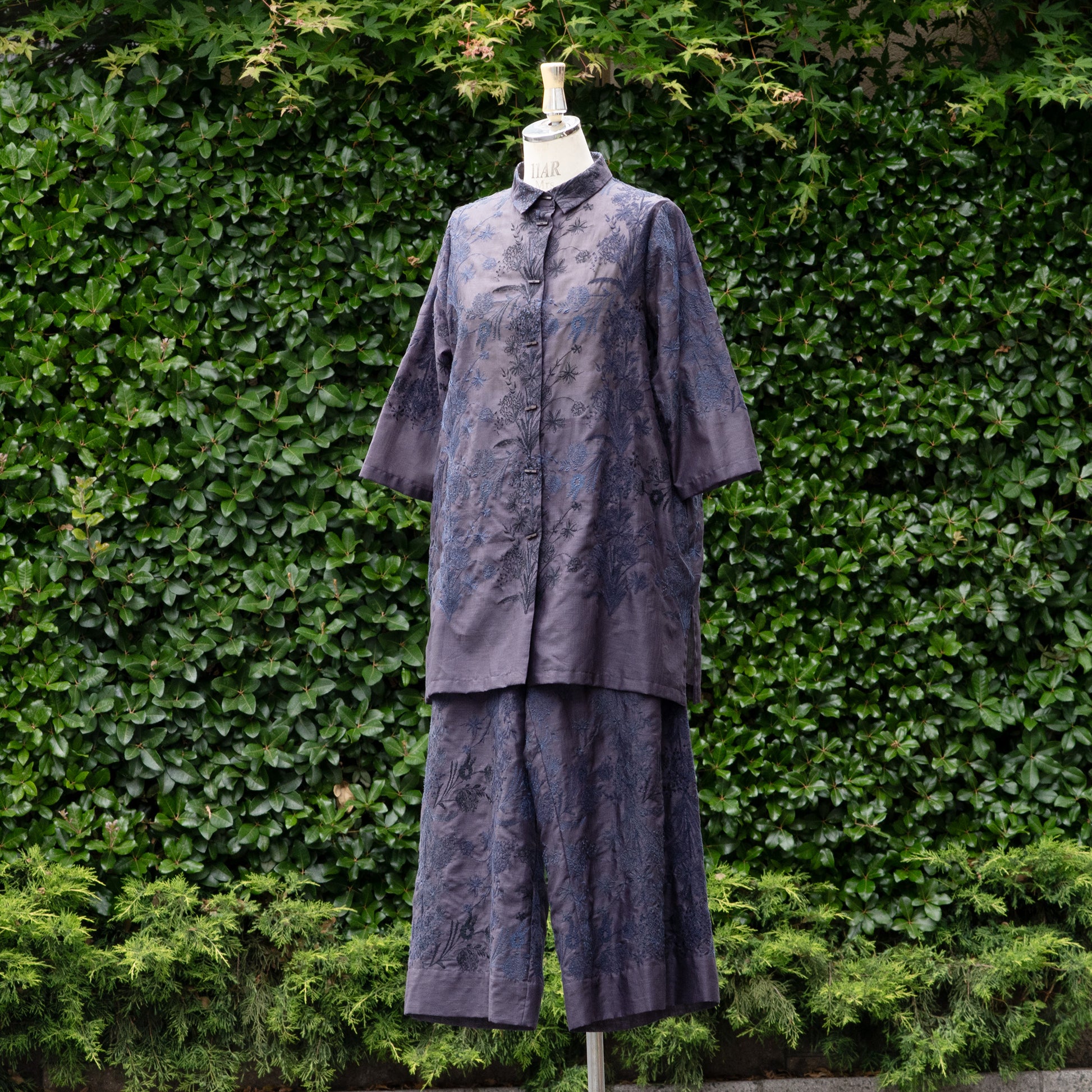 草花の束をモチーフに、深い色合いの4色の糸で2回刺しゅうを施した華やかで上品なカットグラスフラワーの生地です。