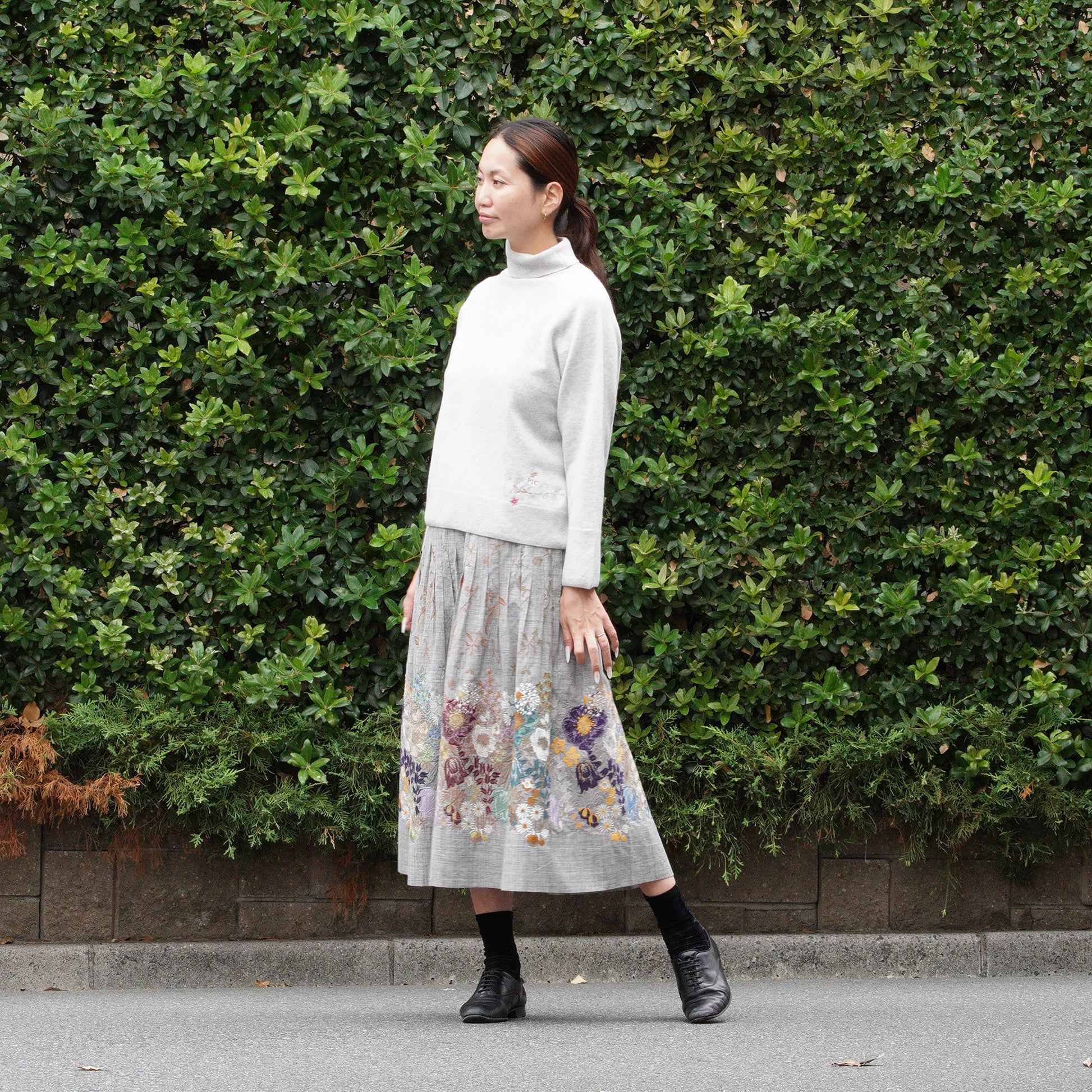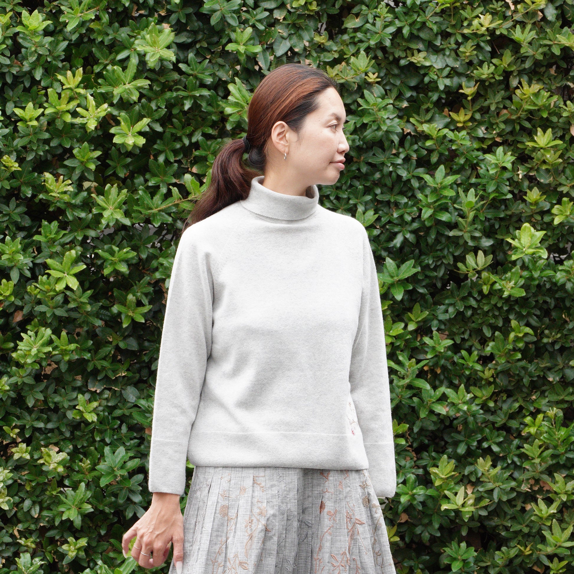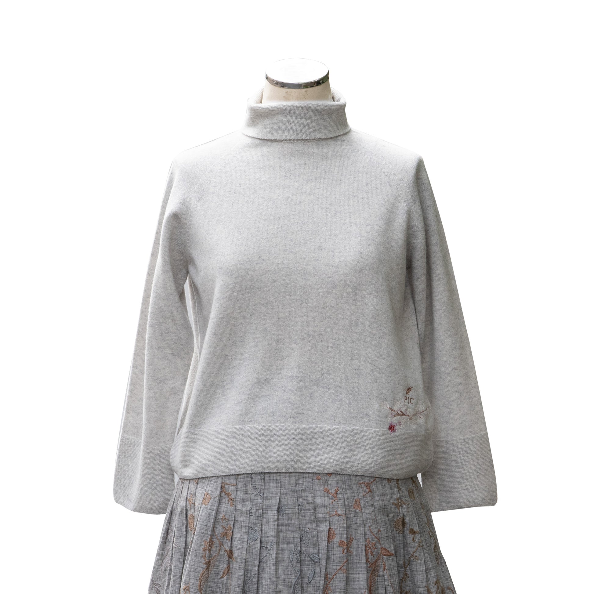 ベーシックなタートルで、ゆったりとしたシルエット。ラグランスリーブで肩のまわりを動かしやすく、裾の左側にPJCロゴと草花の刺しゅうの1ポイントが映えておとな可愛いニットです。花園と葉と茎のスカートとコーディネートされて深まる秋のオシャレをお楽しみください。