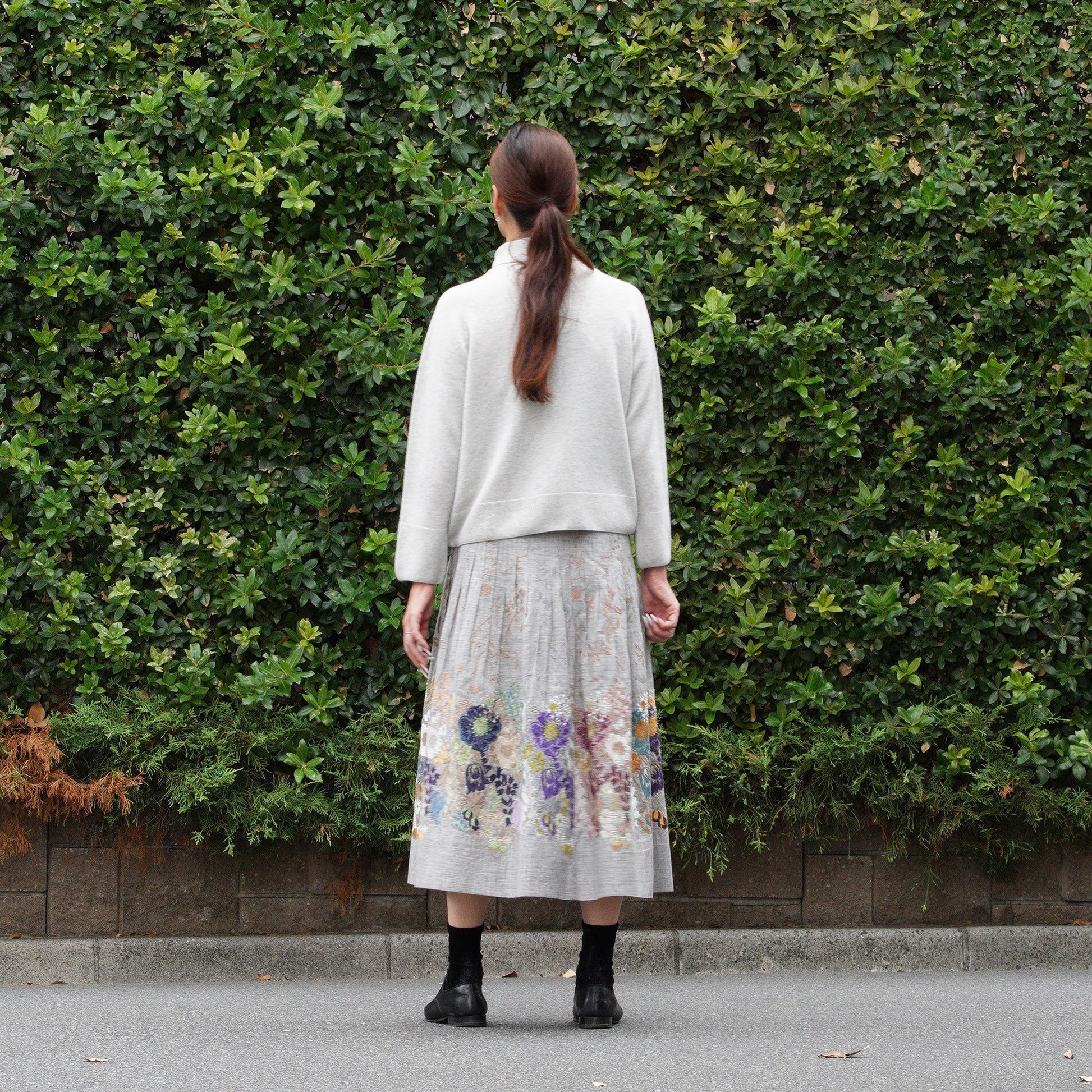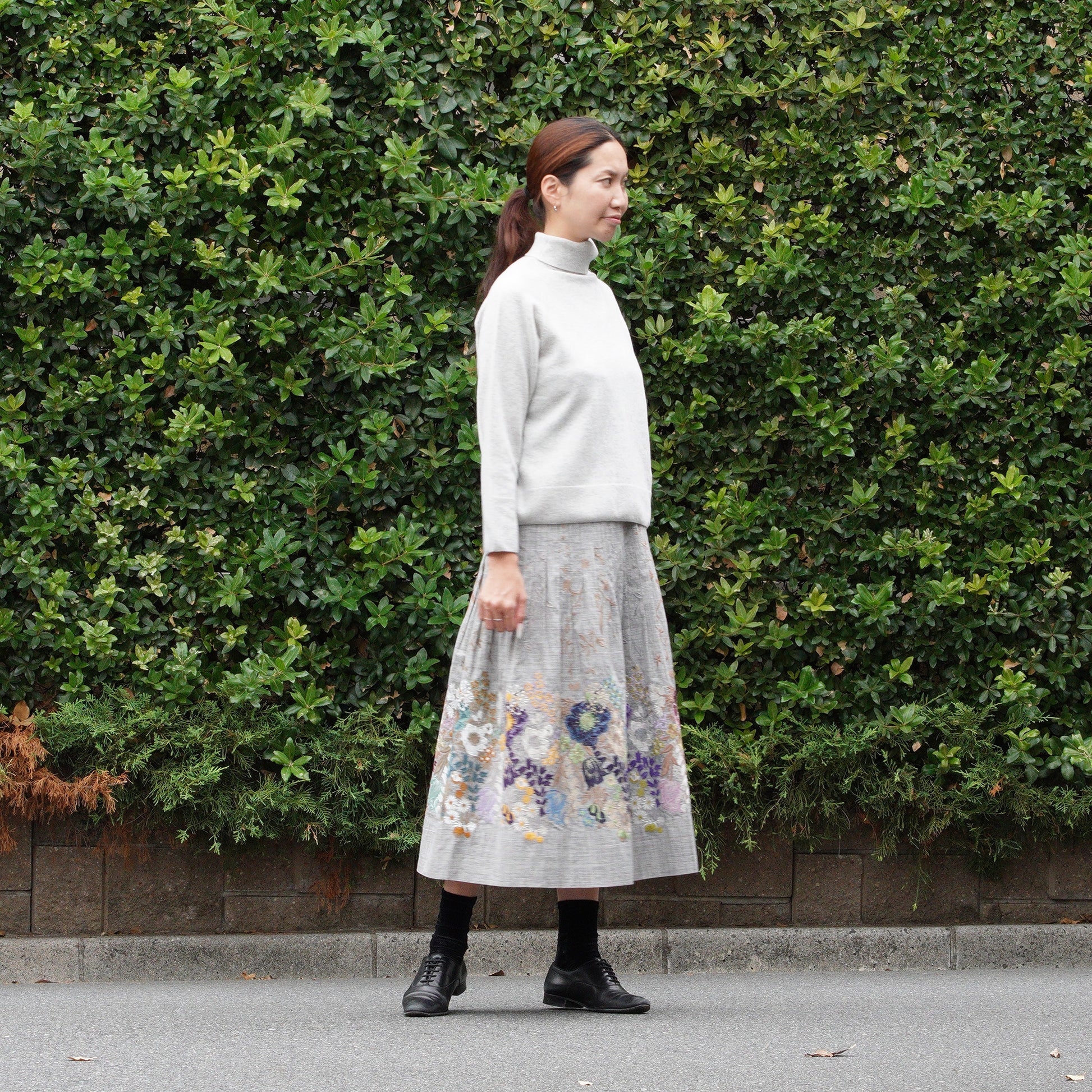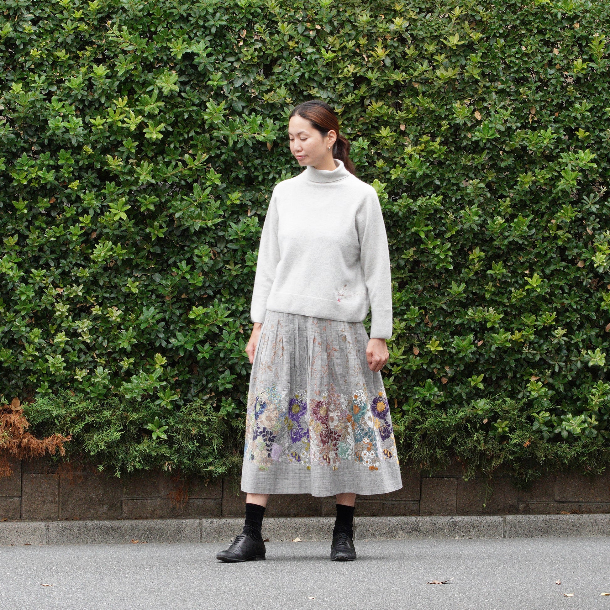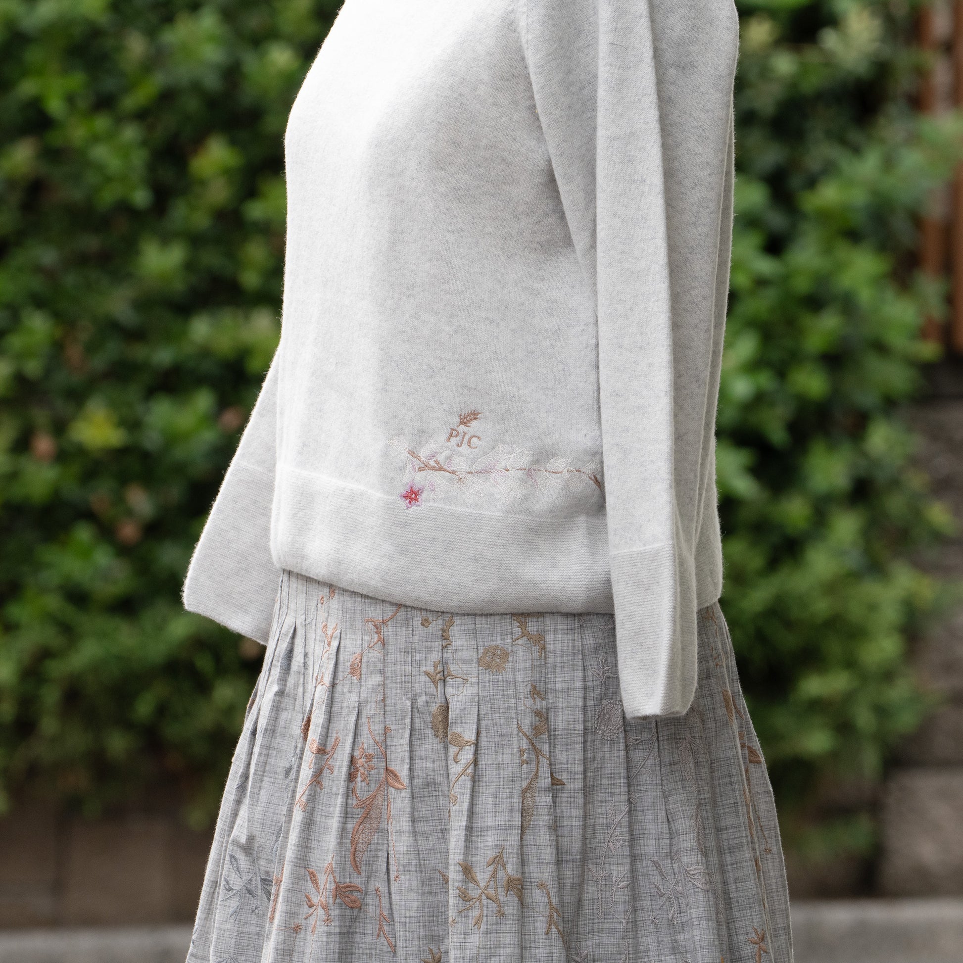 ベーシックなタートルで、ゆったりとしたシルエット。ラグランスリーブで肩のまわりを動かしやすく、裾の左側にPJCロゴと草花の刺しゅうの1ポイントが映えておとな可愛いニットです。花園と葉と茎のスカートとコーディネートされて深まる秋のオシャレをお楽しみください。