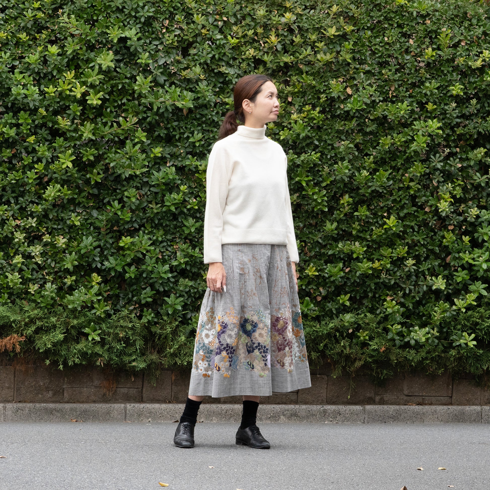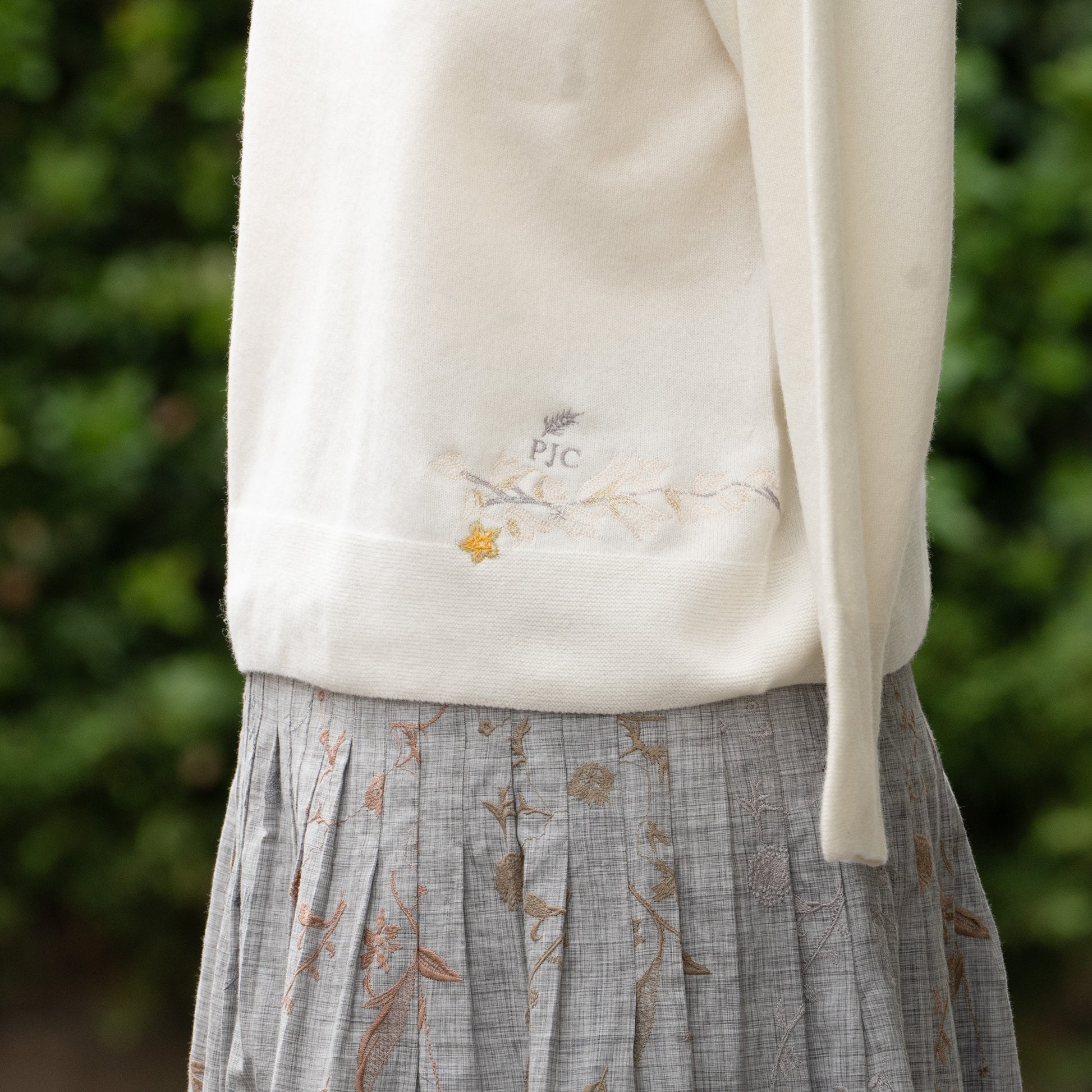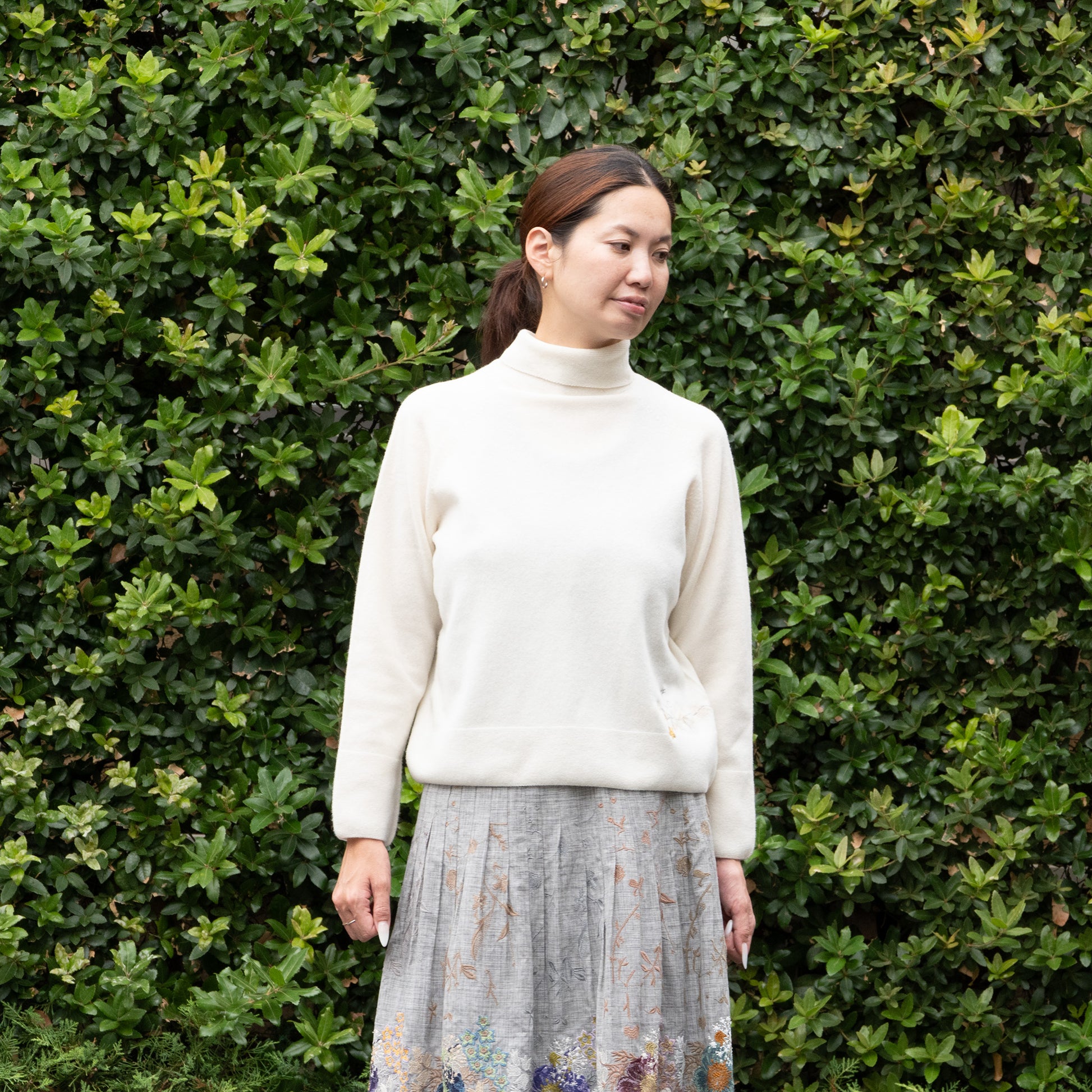 ベーシックなタートルで、ゆったりとしたシルエット。ラグランスリーブで肩のまわりを動かしやすく、裾の左側にPJCロゴと草花の刺しゅうの1ポイントが映えておとな可愛いニットです。花園と葉と茎のスカートとコーディネートされて深まる秋のオシャレをお楽しみください。