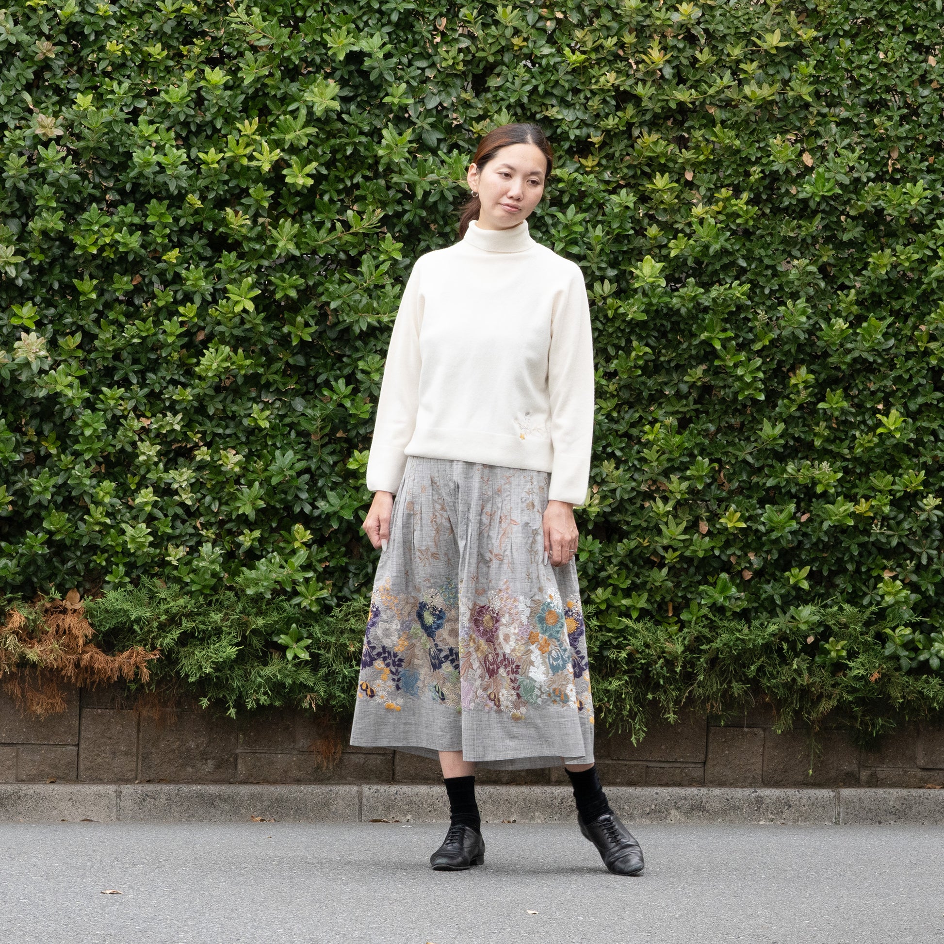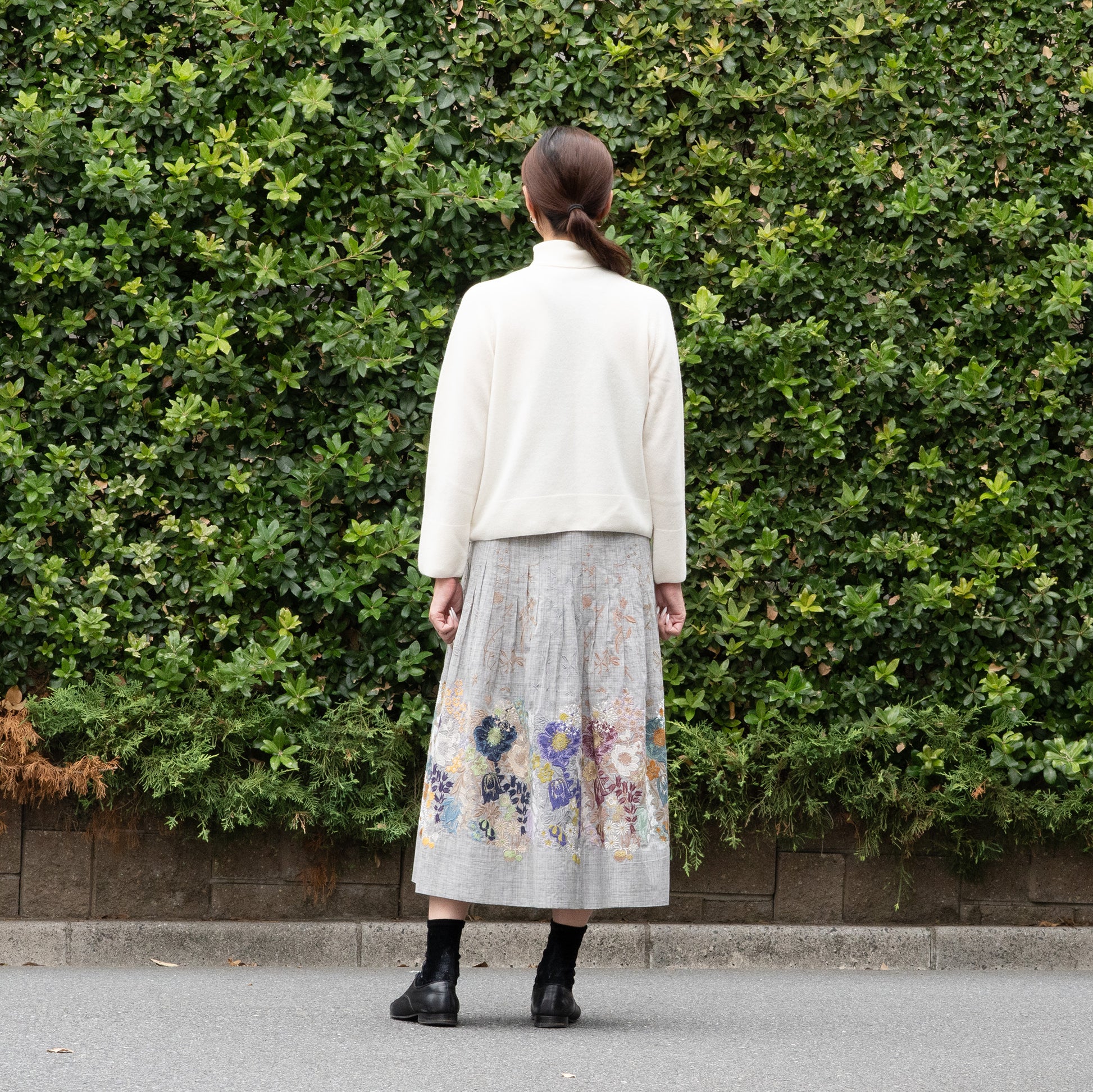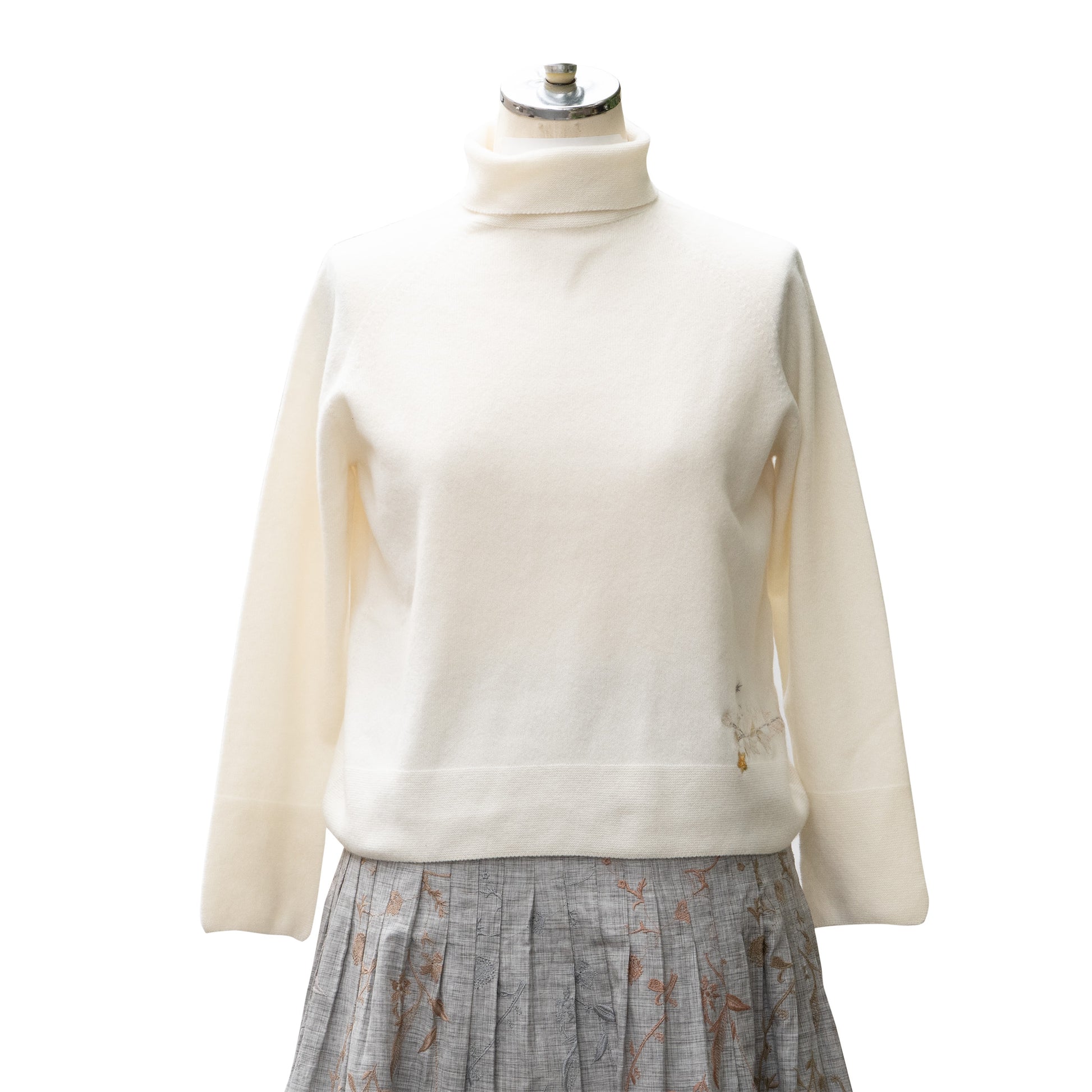 ベーシックなタートルで、ゆったりとしたシルエット。ラグランスリーブで肩のまわりを動かしやすく、裾の左側にPJCロゴと草花の刺しゅうの1ポイントが映えておとな可愛いニットです。花園と葉と茎のスカートとコーディネートされて深まる秋のオシャレをお楽しみください。
