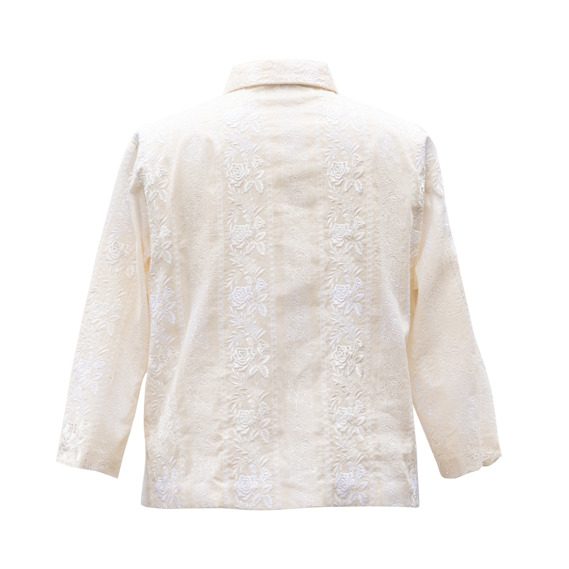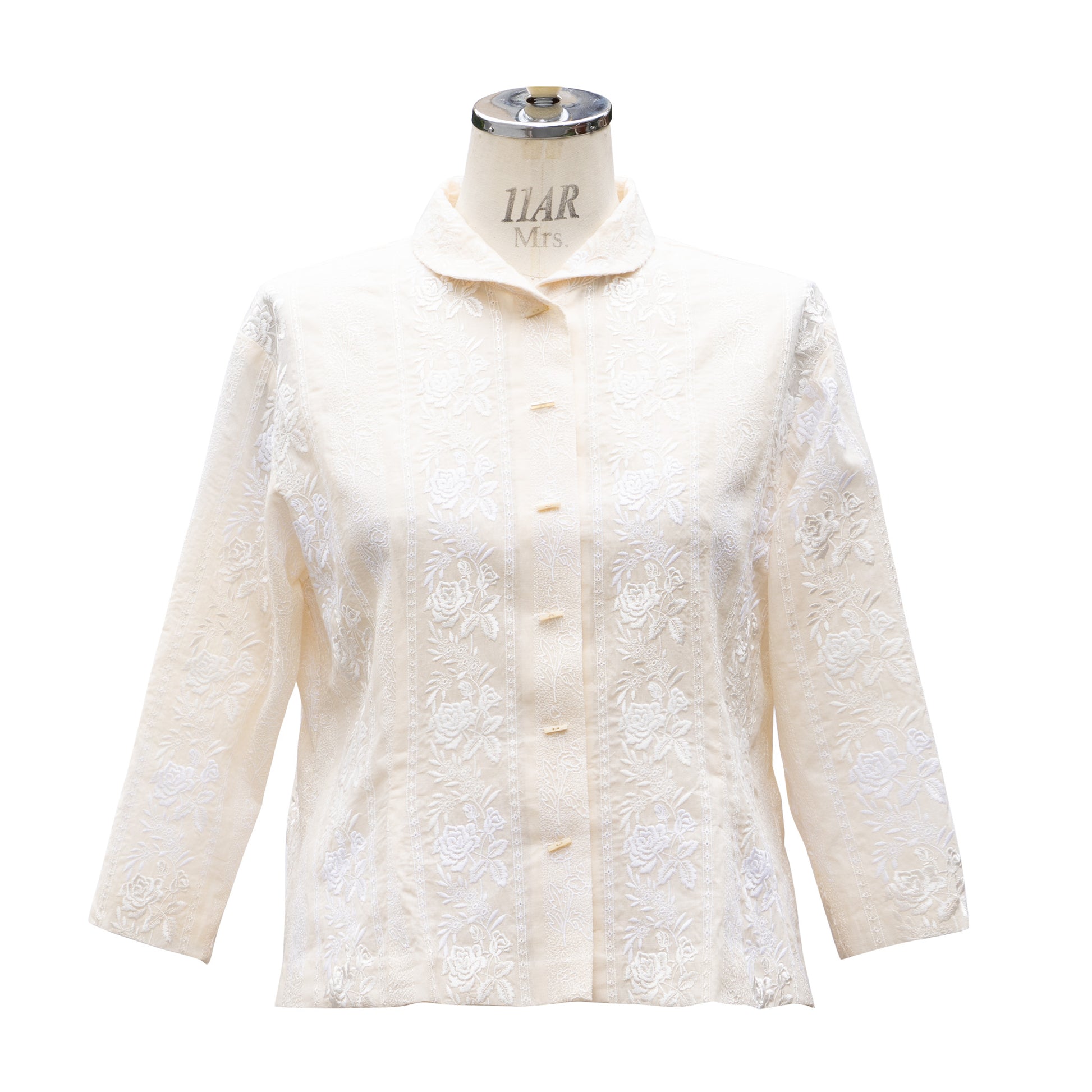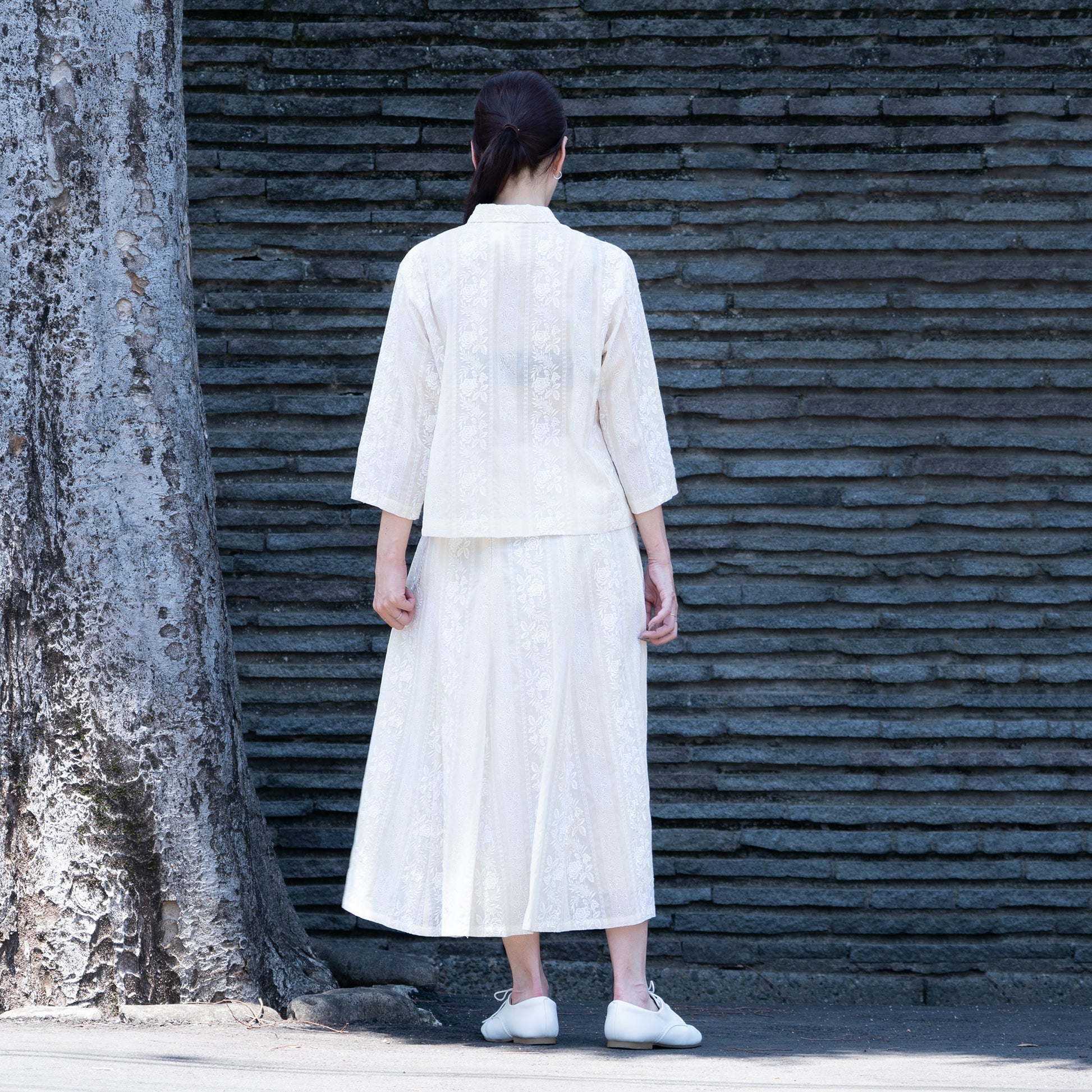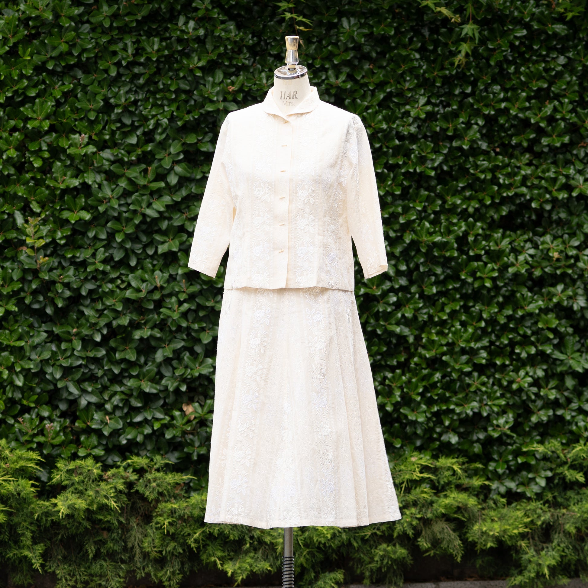 小さなチビ衿がポイント大人可愛いブラウス、8枚剝ぎのスカートとセットアップして華やかな装いを演出します。特別な日のお出かけにぴったりな1着です。