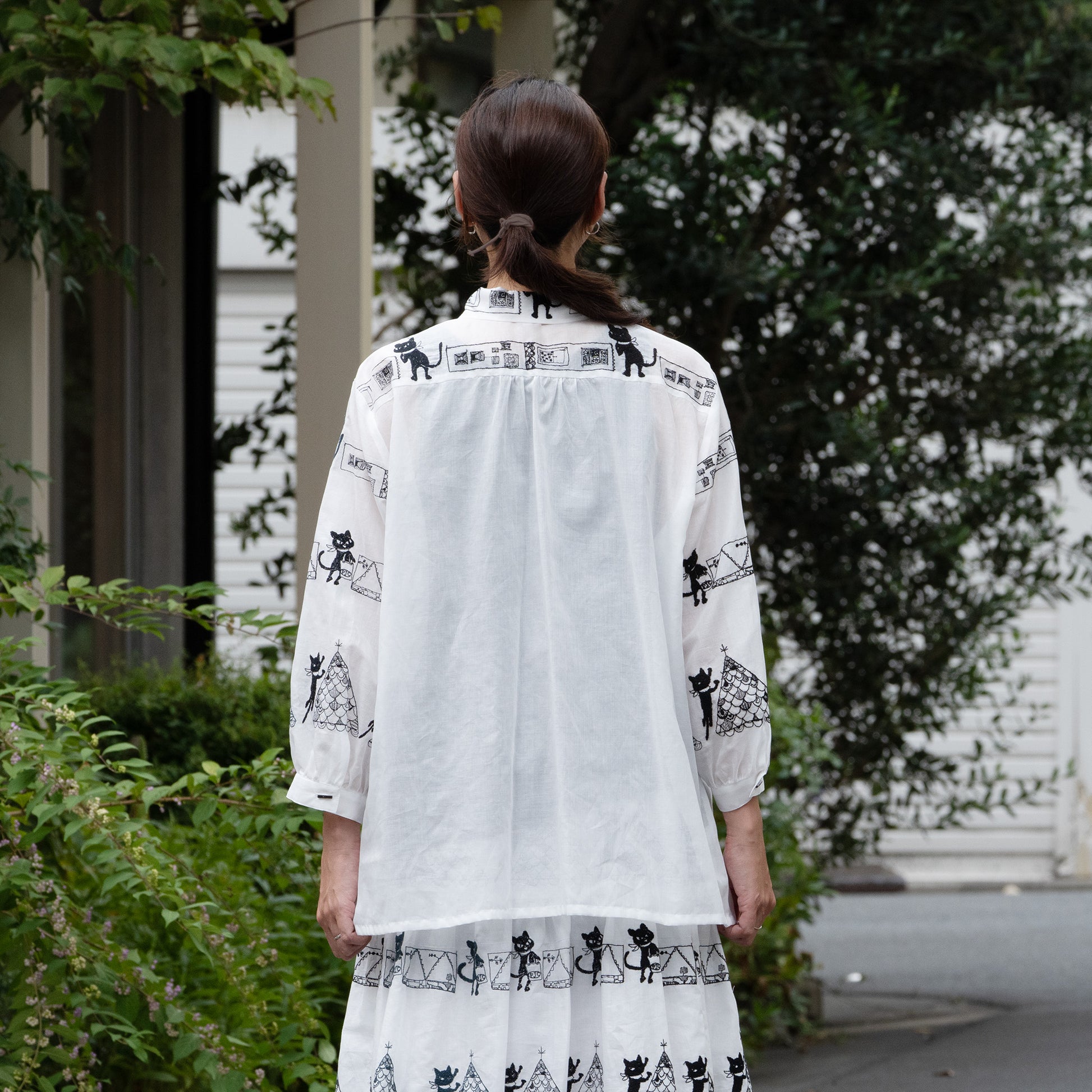 陶芸作家矢合直彦氏の原画に刺しゅうを施しました。街の中に、のら猫クロッチが屋根に寝そべったり、お出かけしたり自然の動物たちと遊んでいる楽しい様子が伺えます。矢合直彦氏とコラボレーションしたレース「街クロッチレーステープ柄」です。